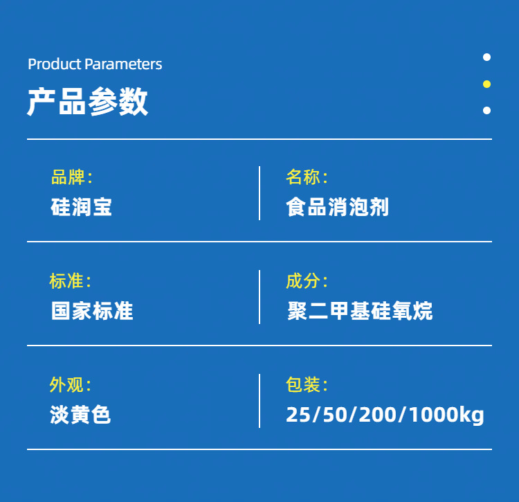 液體消泡劑(乳化硅油)為乳白色粘稠液體,無味,化學(xué)性能穩(wěn)定,在常溫和加熱狀態(tài)下均有良好消泡效果。液體消泡劑(乳化硅油)消泡速度快、抑泡時(shí)間長,無固體不溶物,易于分散,不影響食品原有的風(fēng)味,不改變物料的性質(zhì)和狀態(tài),耐溫性能好,使用方便.